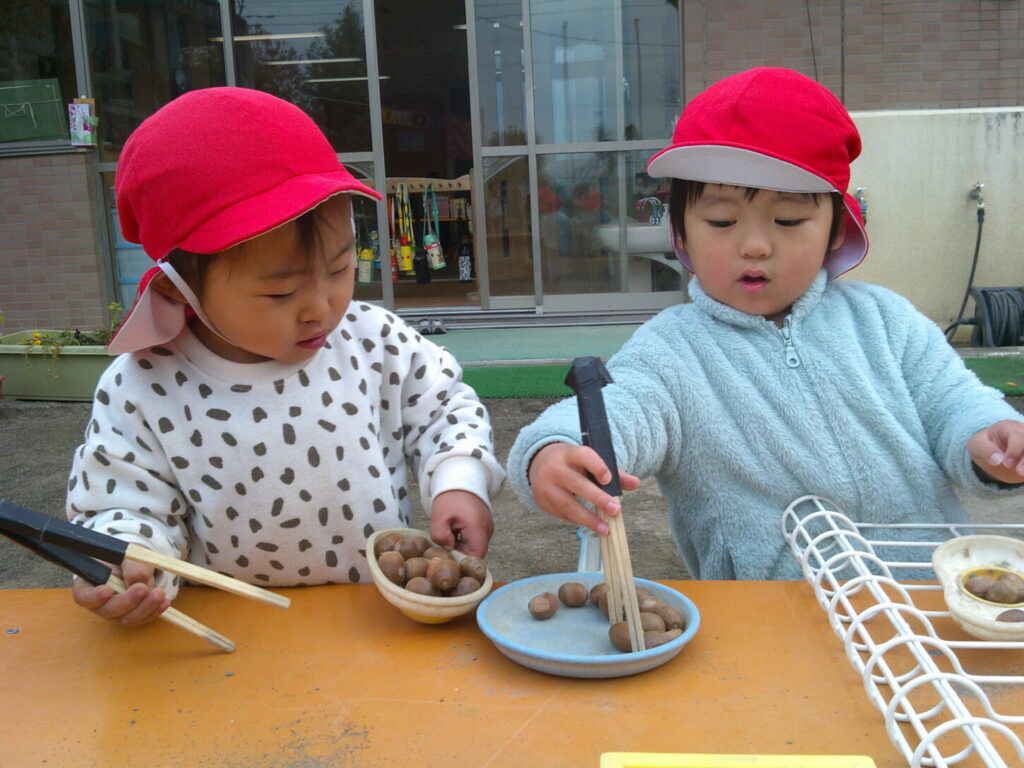 こちらは…お散歩で拾ってきたどんぐりを使ってお料理♪ フライパンでジュージュー!何ができるかな?