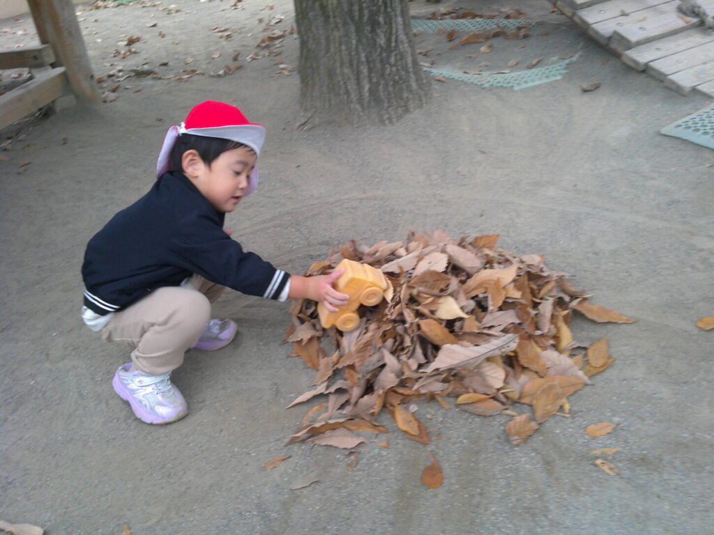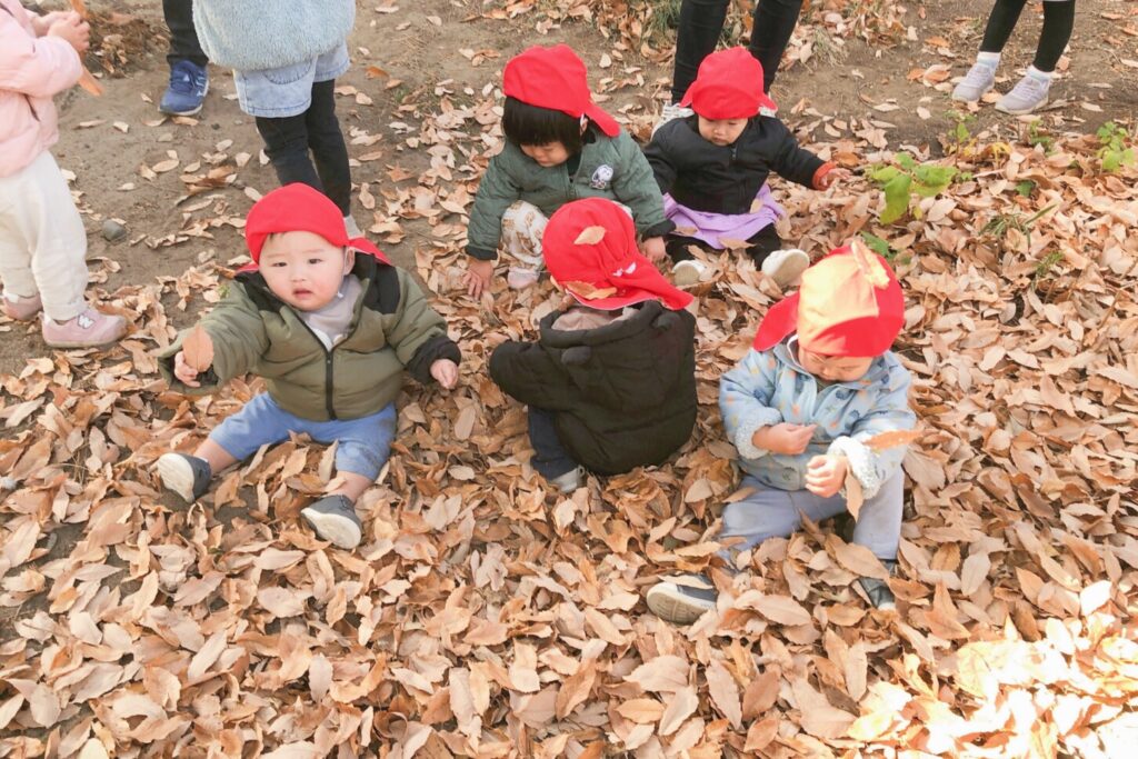 どんぐりなどの木の実をお料理の材料に見立てたり、葉っぱをたくさん集めて上に投げてヒラヒラと舞う様子を楽しんだり、ゴロンとダイナミックに寝転んでみたり…