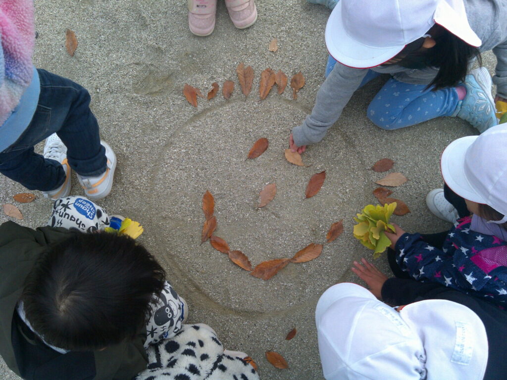 お砂に絵を描いて~葉っぱをまわりにちりばめたら~お顔の完成!葉っぱアート!