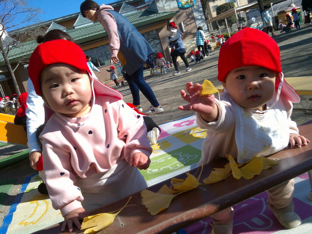 駒形こども園にあるケヤキの木、イチョウの木が黄色や橙色など秋色に色づき、子ども達は葉っぱや木の枝、木の実などの自然物を使って色々な遊びを楽しんでいます。