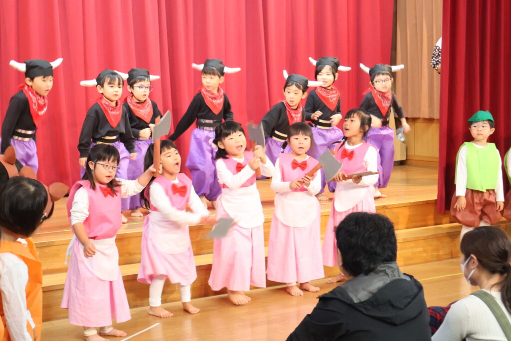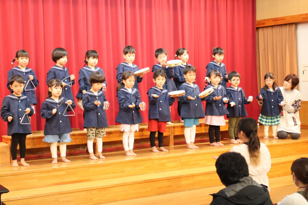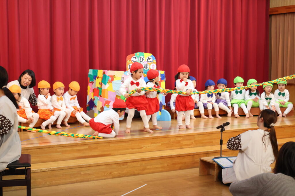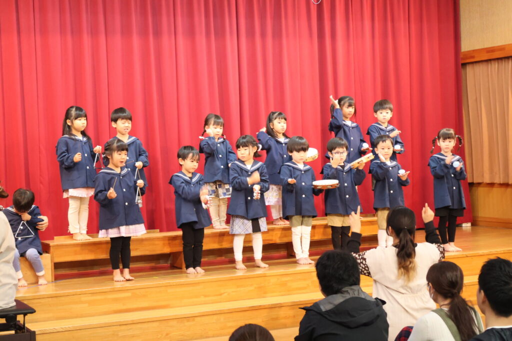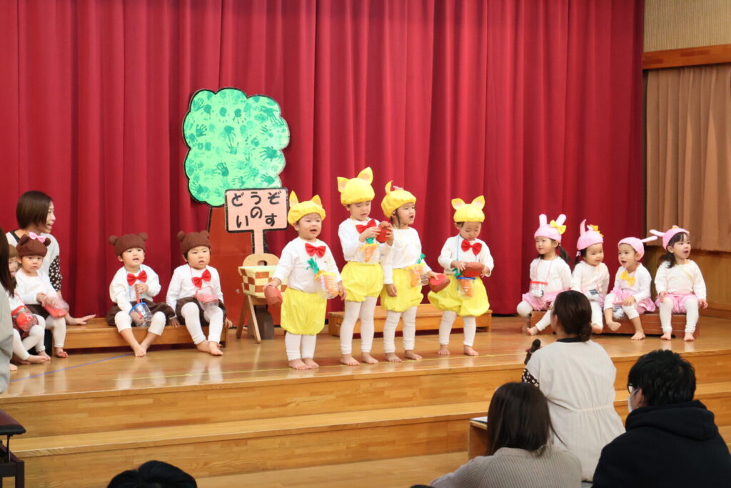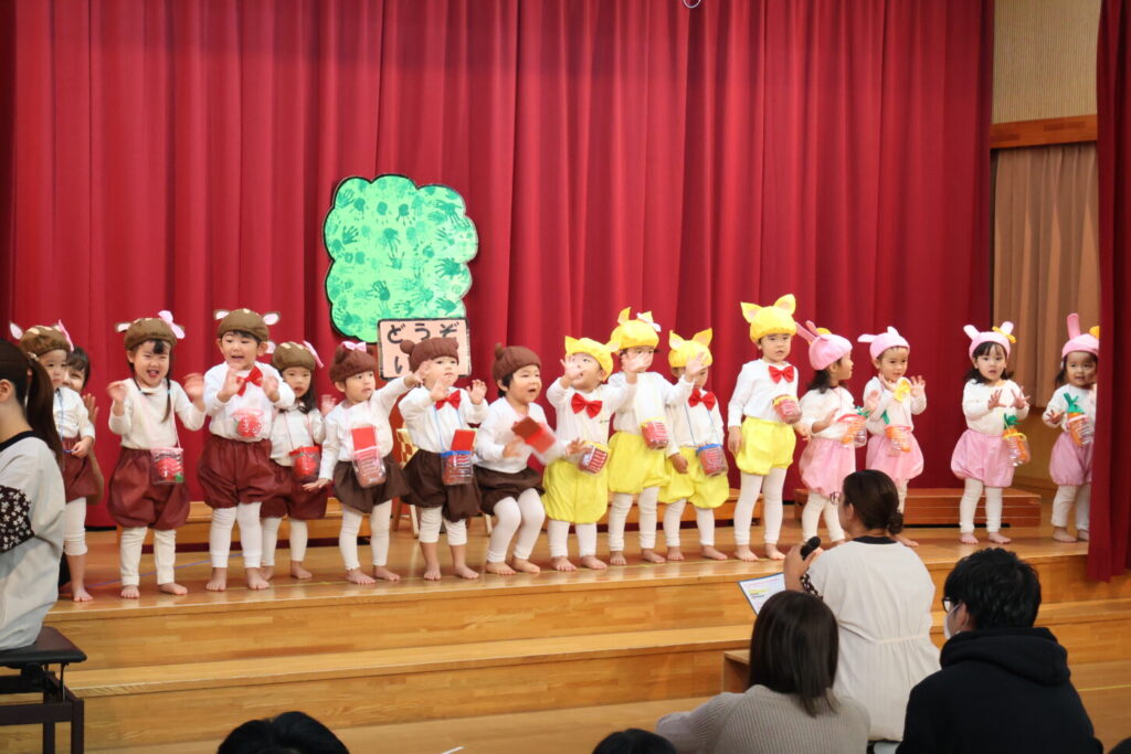 「あと何日寝たら発表会?」と指折り数えながら楽しみにしていた発表会。発表会に向けて、お友だちや先生と一緒に楽しみながら取り組んできました。本番当日はお家の方が見に来てくれ、照れくさそうにしながらもとても嬉しそうだった子ども達。ステージの上に立った子どもたちの姿はいつにも増してキラキラと輝いていました。