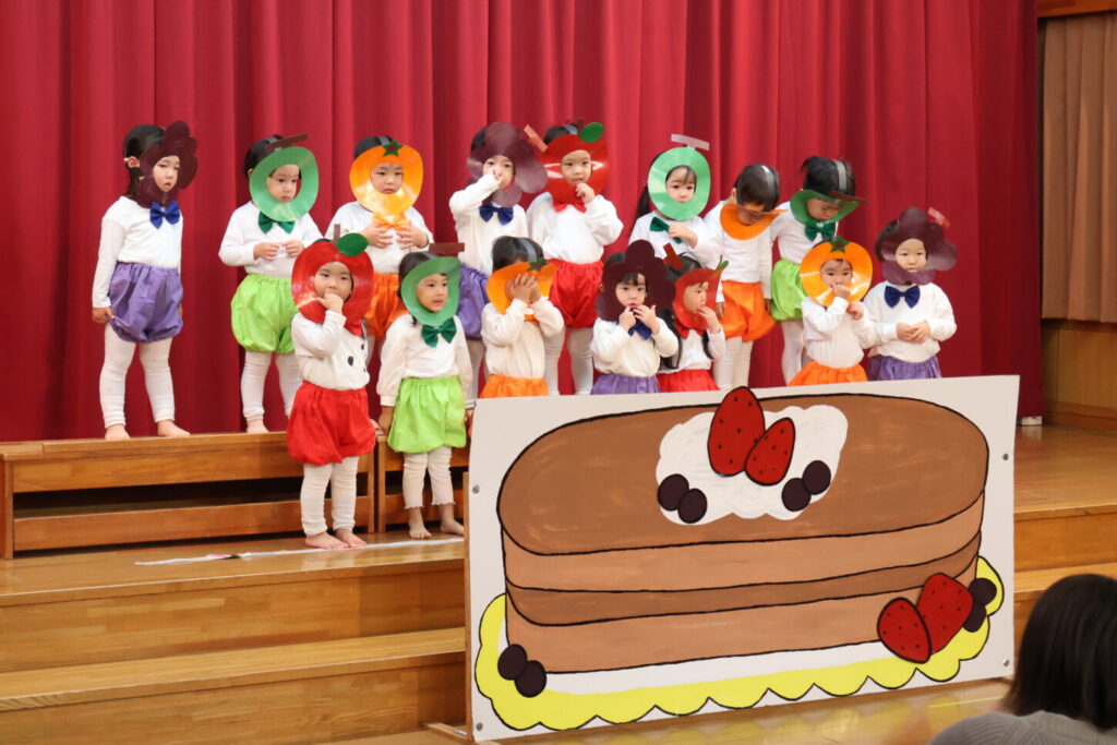 色とりどりの小人さんになって登場!「うんとこしょ~どっこいしょ~」とお友だちと力を合わせ協力しながら引っ張ります。お友だち頑張っているうしろでは、かわいい応援団が!一緒に声を合わせながら応援する姿にほっこり。最後パンケーキの上に飾り付けられたフルーツがとても美味しそうでしたね。