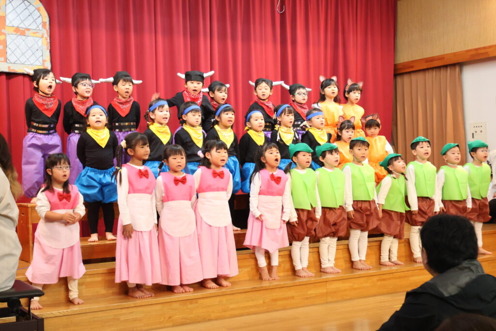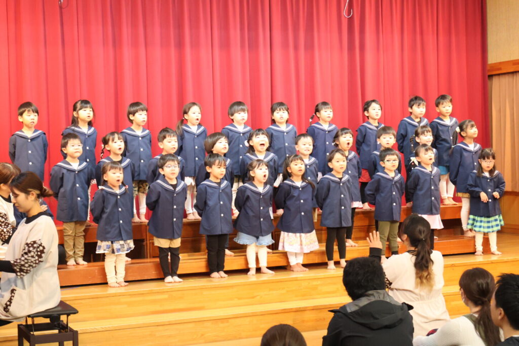 歌が大好きで遊んでいる時間もよく歌を口ずさんでいたぱんだ組さん。発表会当日まで楽しみながら取り組んできました。本番はぴしっと背筋を伸ばして堂々と歌う姿に感動。歌声にのせてみんなの気持ちがお客さんにもしっかりと届いていました。