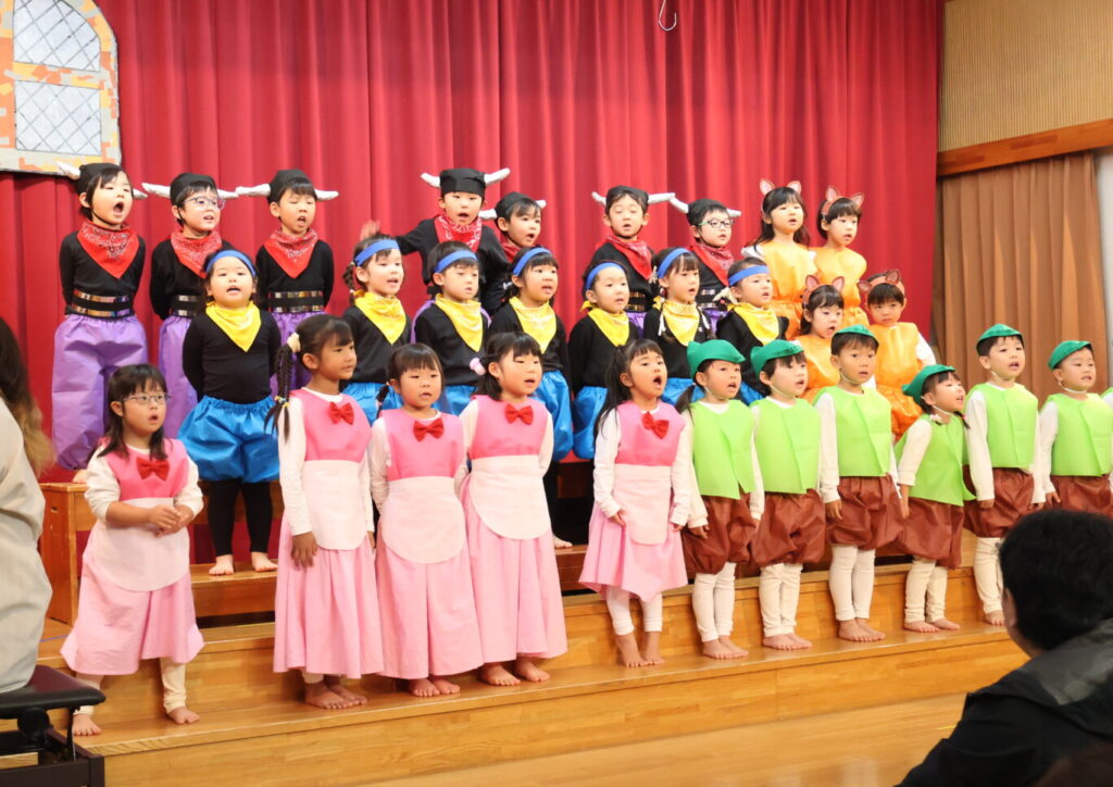 歌が大好きで遊んでいる時間もよく歌を口ずさんでいたぱんだ組さん。発表会当日まで楽しみながら取り組んできました。本番はぴしっと背筋を伸ばして堂々と歌う姿に感動。歌声にのせてみんなの気持ちがお客さんにもしっかりと届いていました。