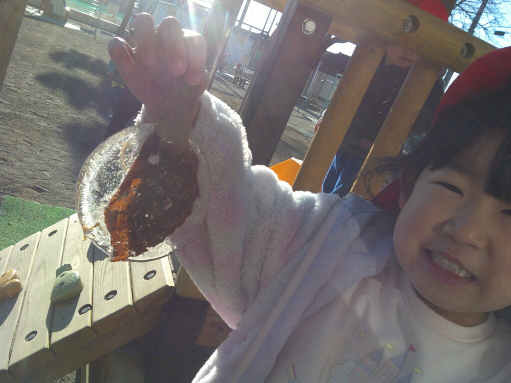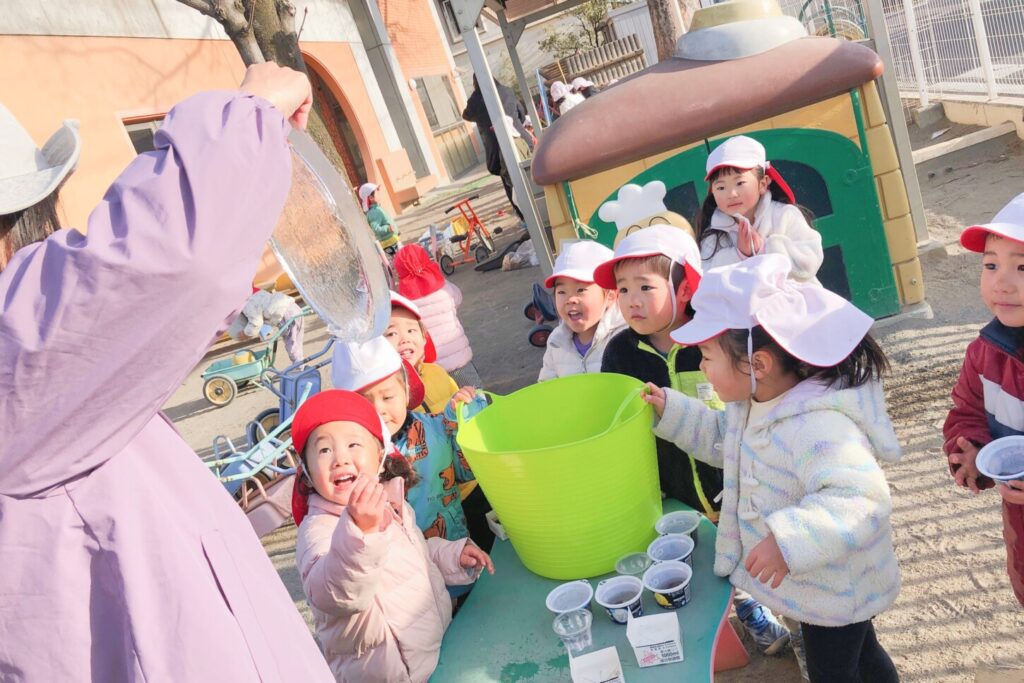 子どもたちと一緒に・・・先生もこっそりと氷作り。大きなバケツにお水を入れておいたらなんとこんなに大きな氷ができました。あまりの大きさに子どもたちは「大きすぎ~!」と大喜び。
