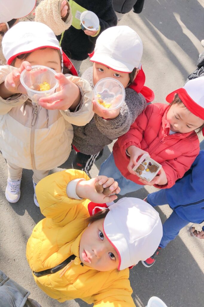 おやつに出たカップを取っておき、氷を作ってみることに!お水の中に入っていた葉っぱが凍っていたこともあり、お花や木などを入れても凍るかもしれないということで、緑道にお散歩にでかけ、氷の中に入れるお花も調達。ちなみにこれは蝋梅の花!黄色い花びらがとてもきれいでしょう。どんぐりも入れてみようかな。