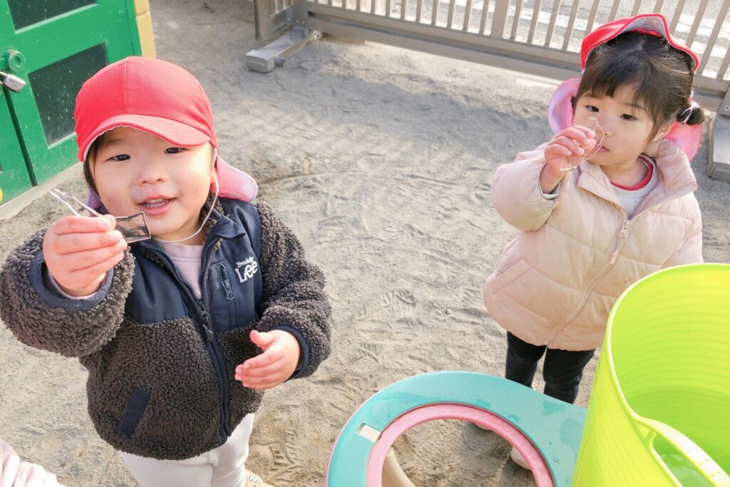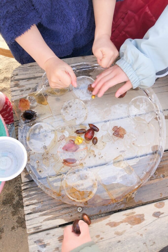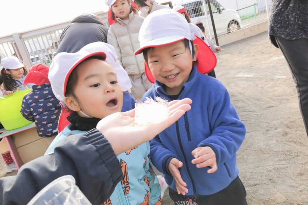 「せんせ~!葉っぱが凍ってる~!」と外の水道に溜まっていた水が凍っていることに気づいた一人のお友だち。大喜びしながらこちらに見せにやってきました。「太陽の光が氷にあたって、キラキラしていてとてもきれ~い!」と一緒に見ているうちにあっという間にお友だちに囲まれてしまいました。氷に興味津々の子どもたち!小さなお友だちは初めて見る氷にびっくり。手を伸ばし触ってみるも、あまりの冷たさに手をひゅっと引っ込めていました。